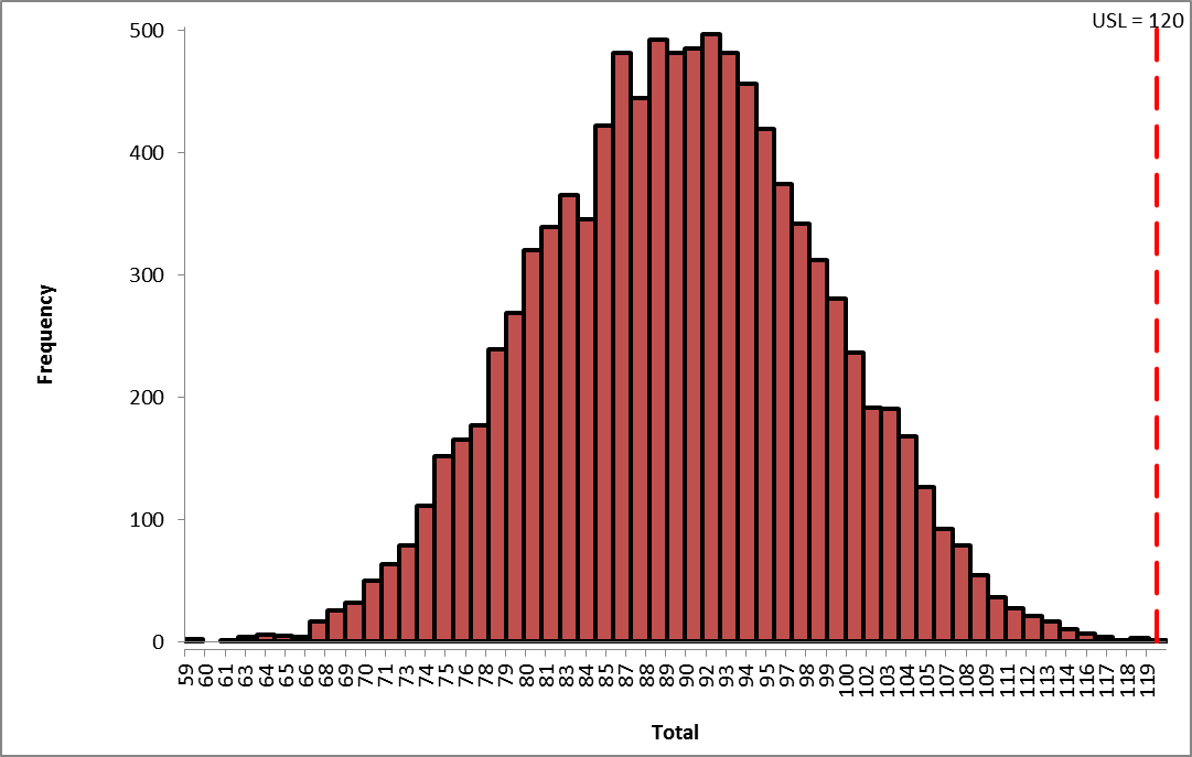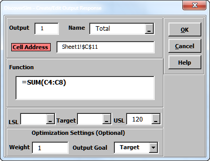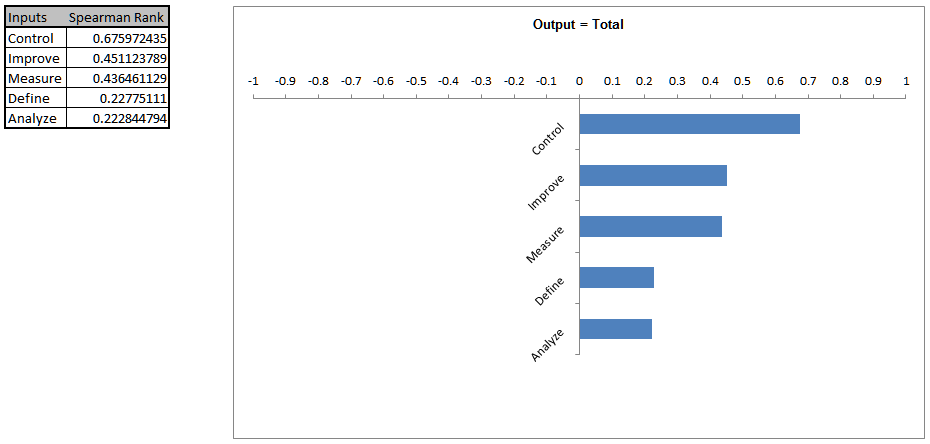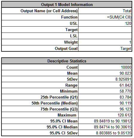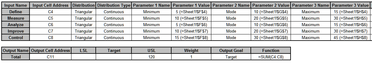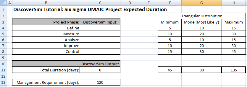 Open the workbook DMAIC Project Duration. This is an example model of a Six Sigma project with five phases: Define, Measure, Analyze, Improve and Control. We are interested in estimating the total project duration in days. Management requires that the project be completed in 120 days. We will model duration simply as: