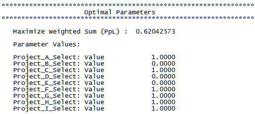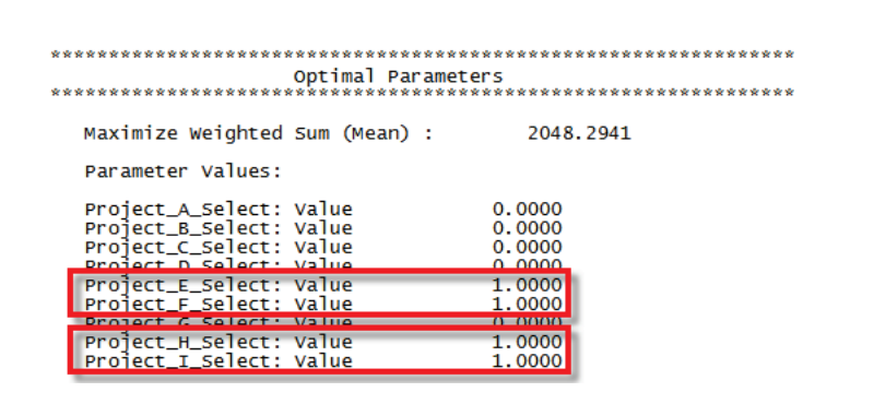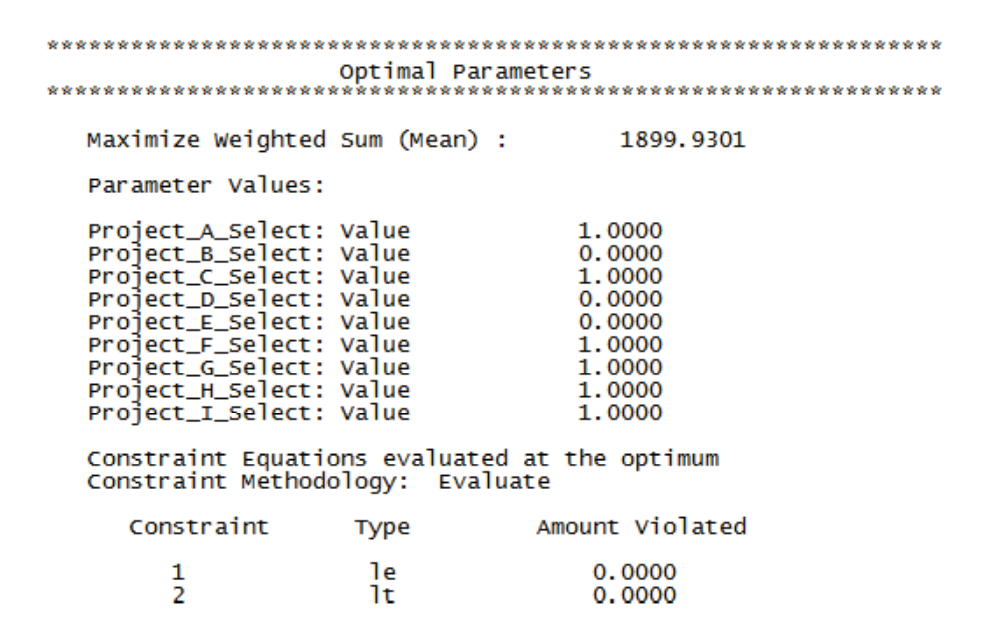 Projects A, C, F, G, H, and I have been selected giving a predicted Mean of