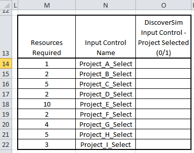 Resources Required are specified for each project. DiscoverSim Input Controls