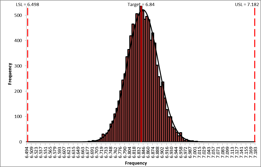 - Enter the output Name as Frequency. Enter the Lower Specification Limit (LSL) as 6.498, Target as 6.84, and Upper Specification Limit (USL) as 7.182.
