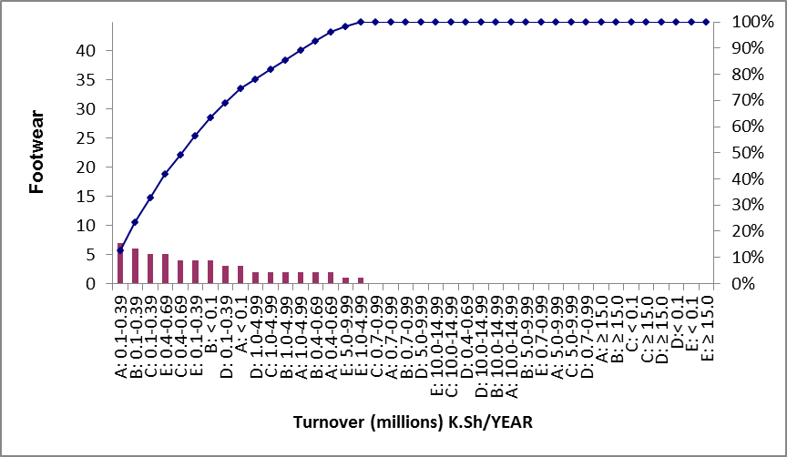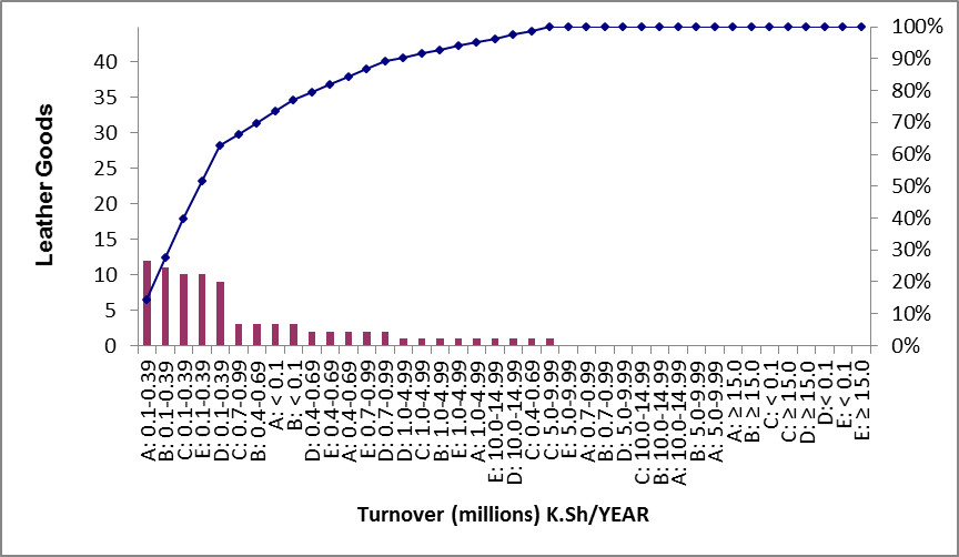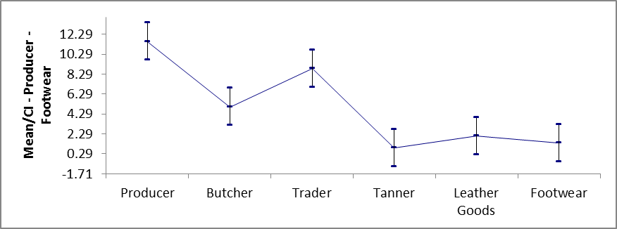 Figure 8: Graphical illustration of the annual turnovers (Million, K.Sh) means and 95% confidence intervals (Vaitkevicius & Kazokiene) within the leather value chain strata covering 2006/07(A) to 2012/13(E) periods (n=240).