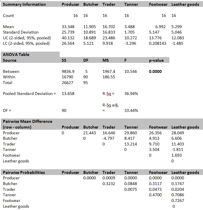 Trade Opportunities Activities in The Leather Strata Summary Information, ANOVA, Pairwise Mean Differences and Related Probabilities (n=96).
